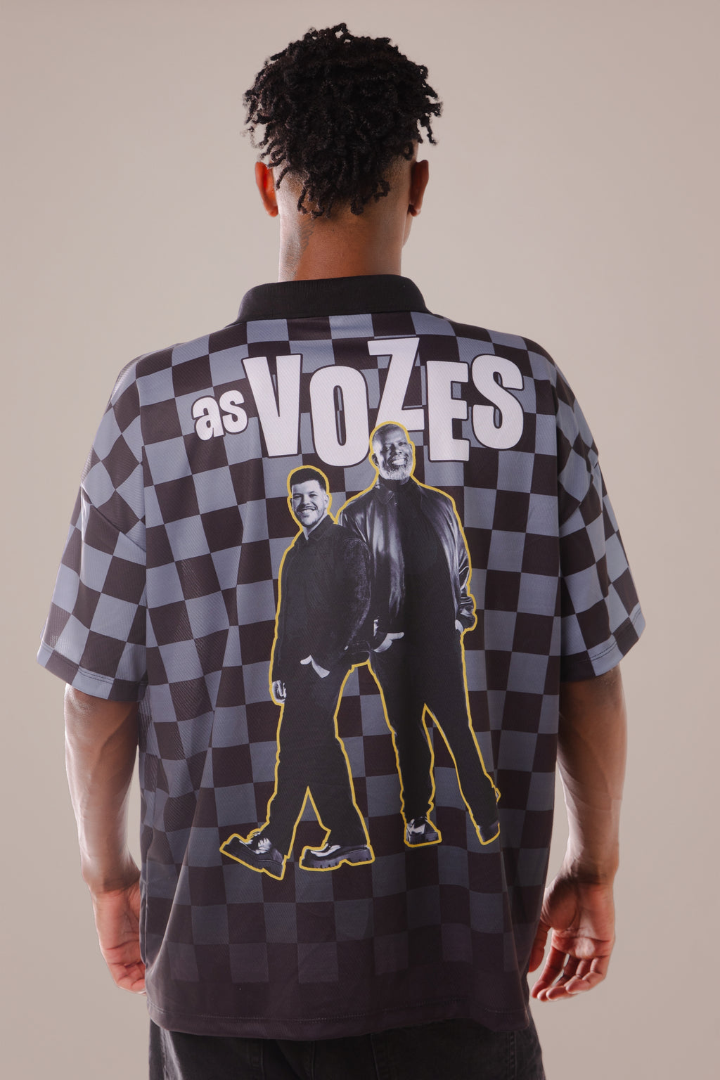 A Jersey As Vozes – Preta traz a força do encontro entre Péricles e Ferrugem em uma estética mais urbana, marcante e atemporal. O fundo xadrez em preto e cinza cria uma base pesada, street e cheia de personalidade, enquanto a arte nas costas transforma a peça em um verdadeiro pôster vestível. Na parte frontal, os grafismos em branco e dourado destacam os nomes dos artistas com impacto e identidade. Já nas costas, a imagem dos dois ícones reforça o conceito do projeto As Vozes — não é só sobre música, é sobre legado. A gola polo preta mantém a referência das jerseys clássicas, conectando esporte, cultura de rua e pagode em uma única linguagem visual. Uma jersey feita pra quem carrega o som no peito e o respeito na postura.
